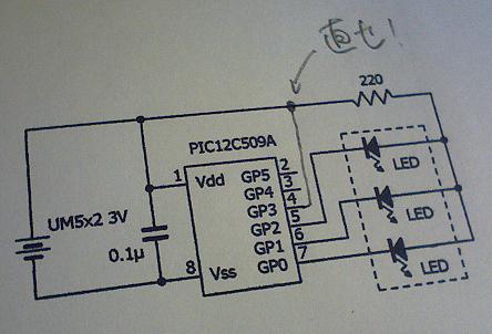 今回使うPICは12C509という、ちょっと古めの、書き込みは1回だけしか出来ない「(鶴田浩二のような)男気